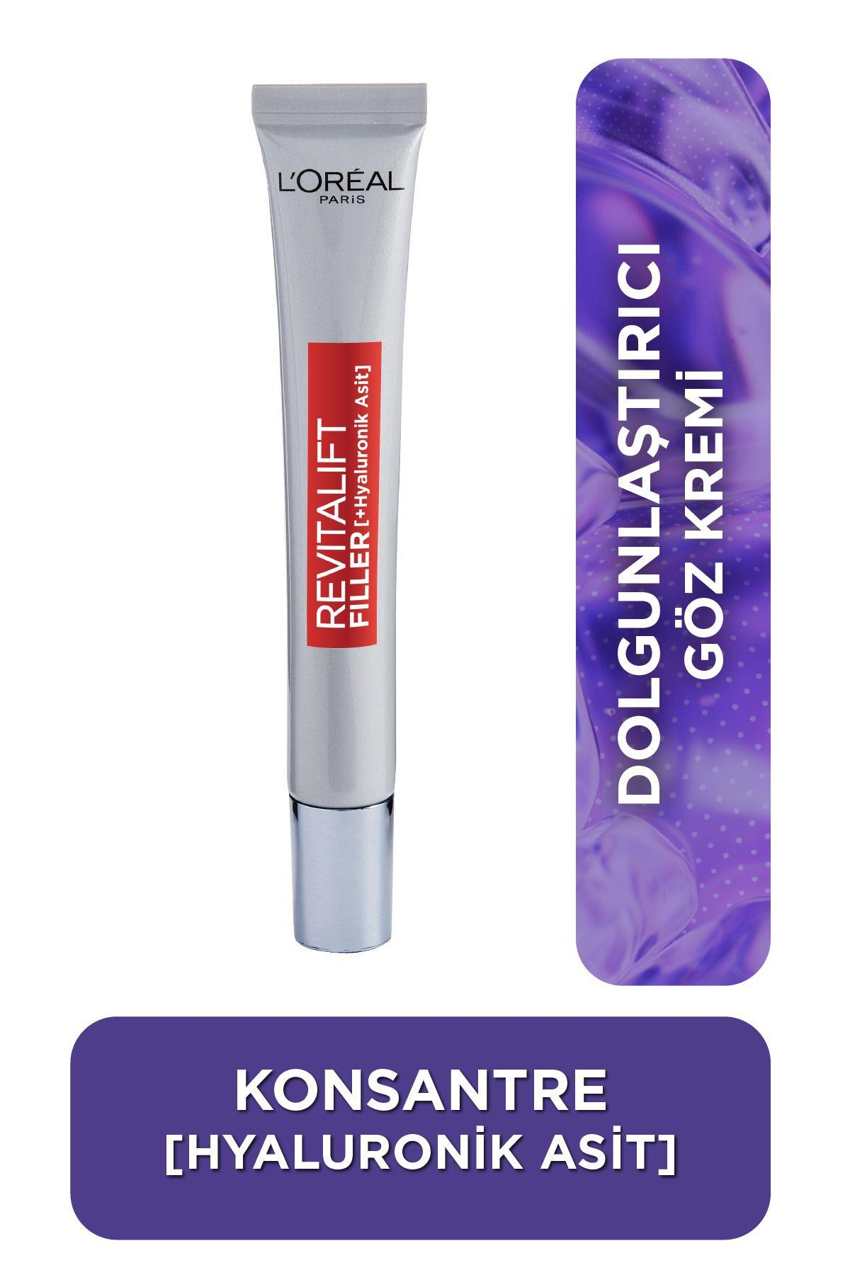 Kırışıklıkları doldurur & göz altı çukurunu dolgunlaştırır. Konsantre Hyaluronik Asit: Cilt bakımının yıldız içeriğiyle zenginleştirilmiş formülü cildi dolgunlaştırmaya, pürüzsüzleştirmeye ve yoğun şekilde nemlendirmeye yardımcı olarak kırışıklık görünümünü azaltır.Anında: Cildi etkili şekilde nemlendirir, cildin gerginliğini (+25%*) ve sıkılığını (+%14*) arttırır.4 Haftada: Kaz ayağı görünümü (-%11**) azalır. Göz altındaki çukur görünüm azalır (-%10***). Göz çevresi görünümü gelişir.Tüpü hafifçe yüzünüze bastırın, sabah ve akşam metal ucuyla, gözün iç köşesinden dış köşesine doğru nazikçe masaj yaparak uygulayın.*Instrumental Test, 40 kadın**Klinik skorlama, 58 kadın***Klinik Skorlama, 40 kadın