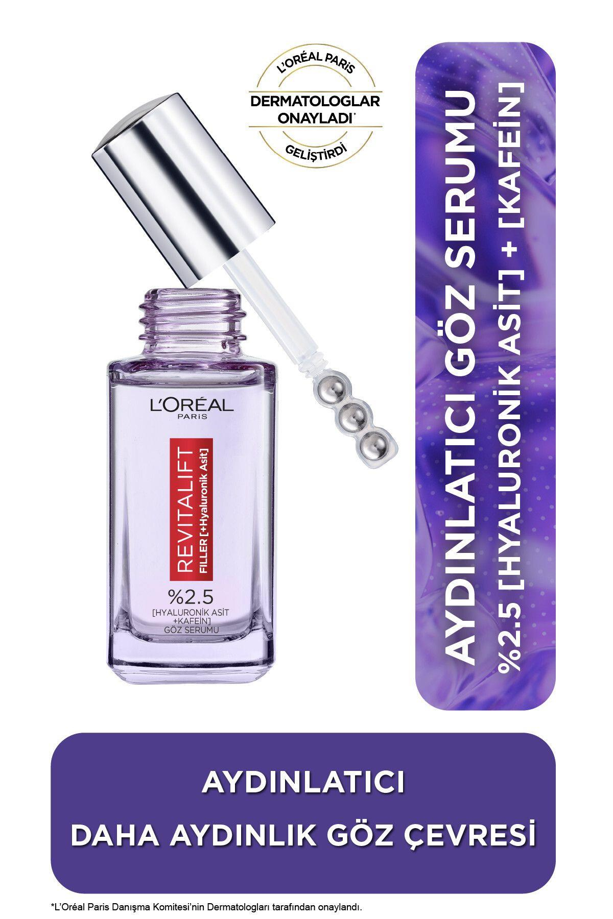 L'oreal Paris'in Gözlere Özel İlk Serumu, %2.5 [Hyaluronik Asit + Kafein] içeriği, paslanmaz çelik bilyeli özel masaj aplikatörü.